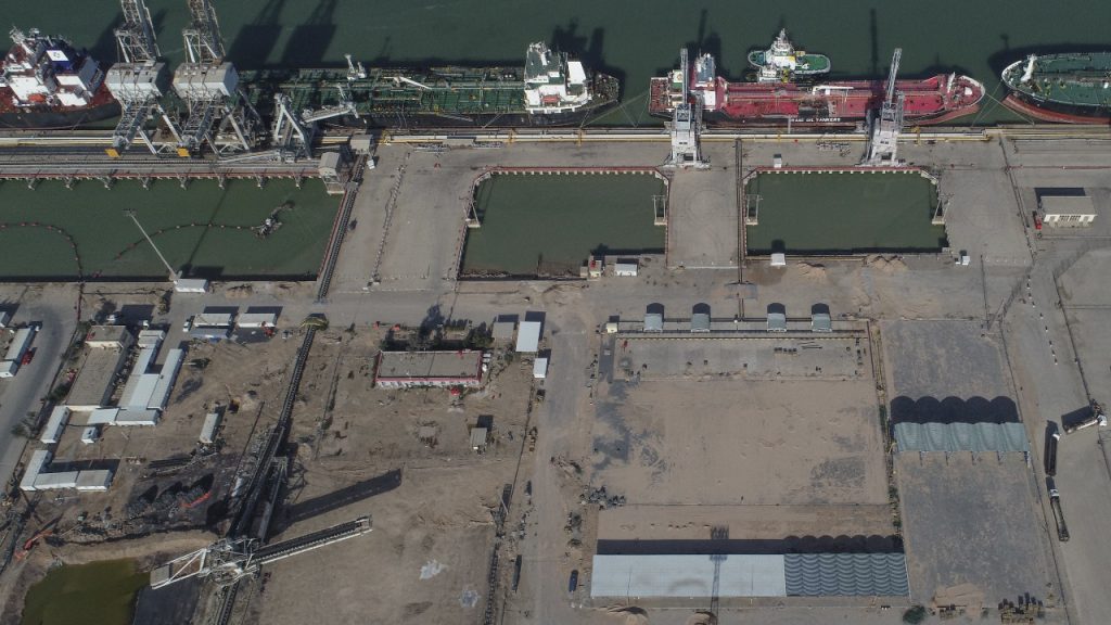 - المنشآت قائمة على ركائز أنبوبية بعمق 30 – 40م وتستقبل ثلاث ناقلات بسعة 50,000 طن.